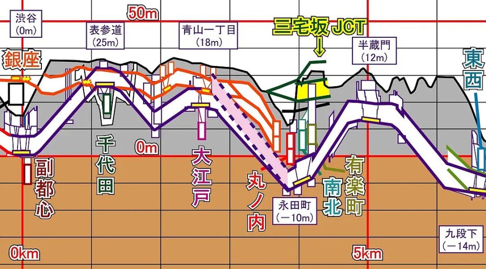 半蔵門線的一段剖面图,上方橙色的就是銀座線