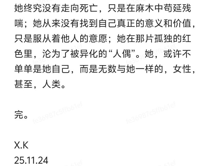 代表温柔的粉色,代表幻想的紫色,在女主与克拉多偷情时,在她与孩子一起享受温馨的时光时,都有短暂的出现过,但紫色的幻想,昙花一现,某次,女主在克拉多的房间里发现了别的女人,那一刻,她忽然明白了,自己所寄托的男人,并不把自己当做唯一,克拉多,也只不过是一个贪图女性肉欲的男人,温柔的粉色,本就依附于紫色而存在,当紫色的镜花水月破碎斑驳之时,粉色的温柔,如樱花般消逝。
